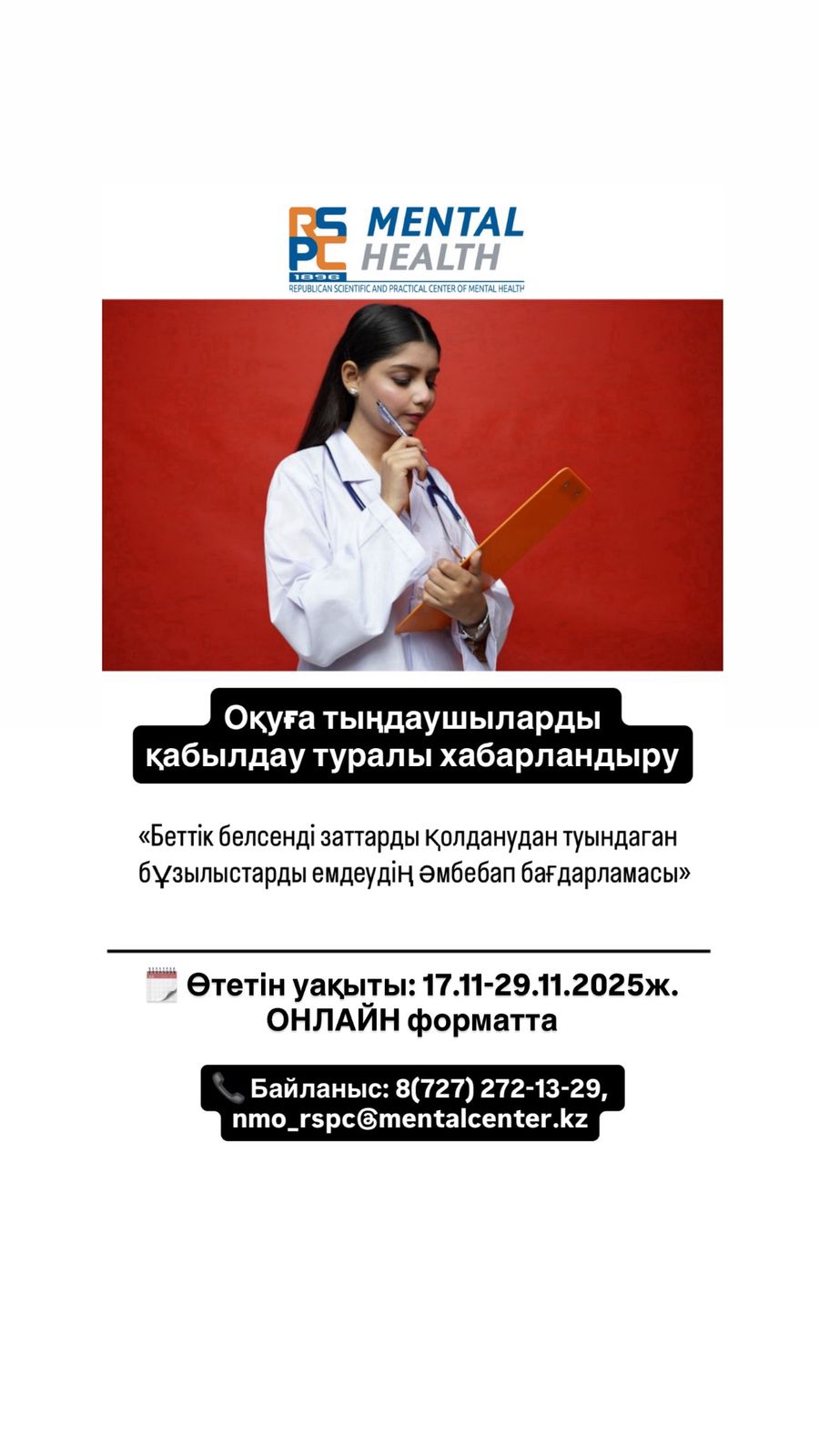 ҚР ДСМ «Республикалық психикалық денсаулық ғылыми-практикалық орталығы» ШЖҚ РМК «Беттік белсенді заттарды қолданудан туындаган бұзылыстарды емдеудің әмбебап бағдарламасы», ұзақтығы 120 академиялық сағат/4 кредитті құрайтын, 17.11-29.11.2025ж. өтетін білікті арттыру циклына тыңдаушыларды қабылдау басталғанын хабарлайды. Оқу ОНЛАЙН форматта.